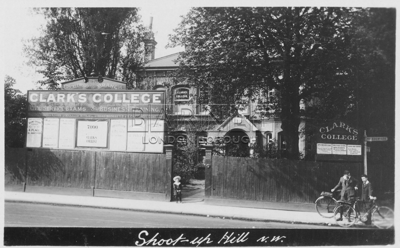 Clark's College was cituated on the junction Walm Lane and Shootup Hill. It was replaced by Slade Court around 1964.