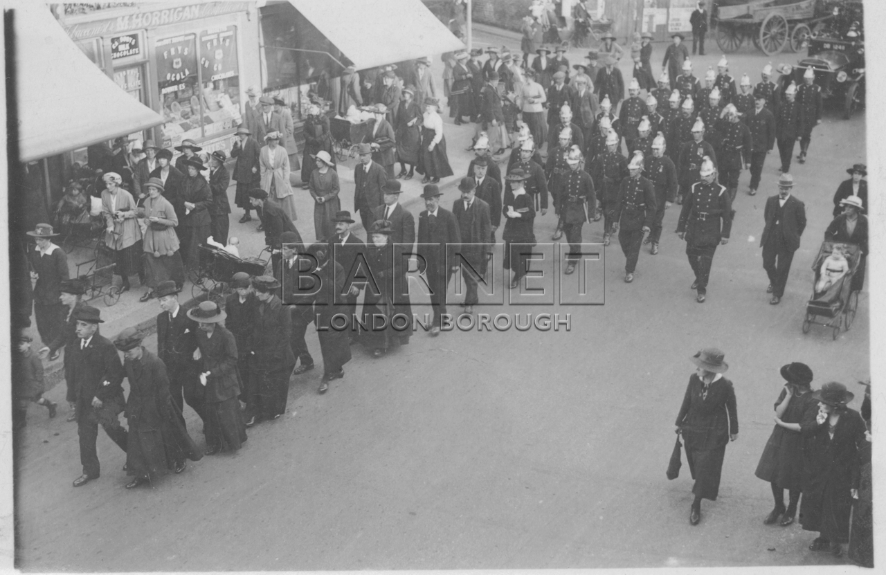 Funeral of a member of the brigade William Dickens, who died in 1920. View is from the upper floor of the Church House