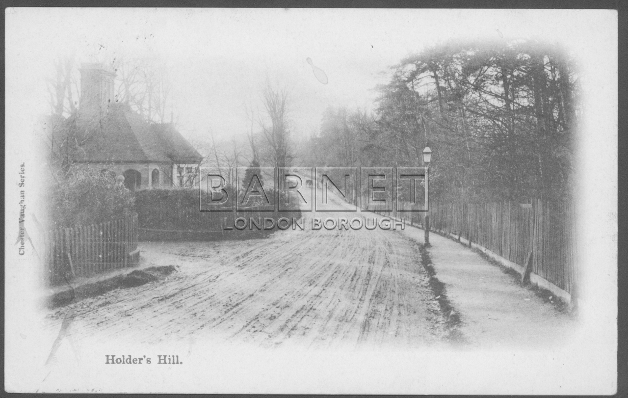 The old lodge to Holders Hill House is on the left of the photograph (demolished before 1935.) It marks the turning of what is now Holders Hill Avenue.