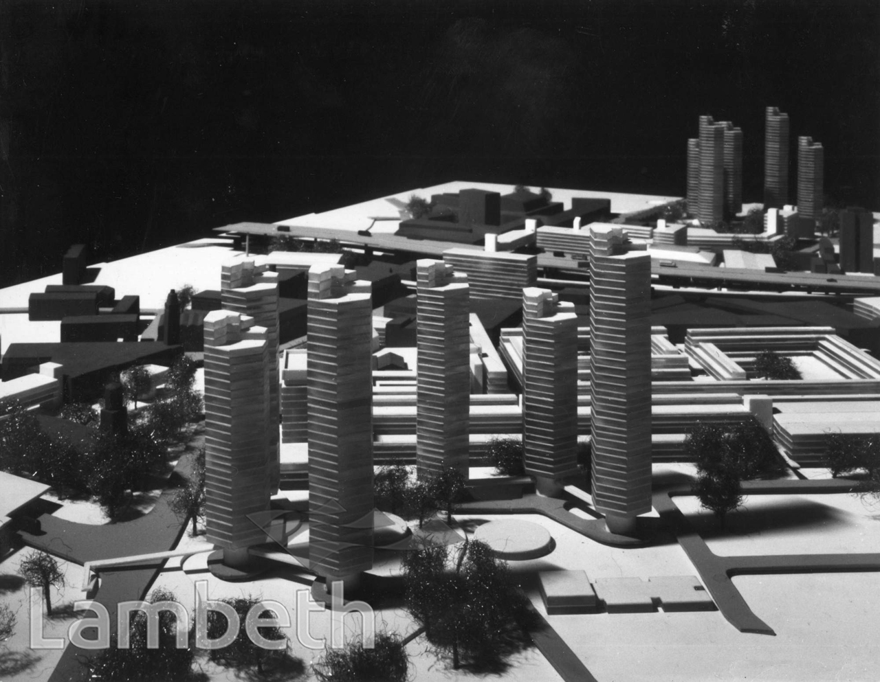 Model for the redevelopment of Brixton town centre seen from above Effra Road looking north. Designed by Ted Hollamby, Lambeth's Chief Architect and Town Planner, the proposal included a flyover above the railway line and fifty-storey blocks of flats. However, due to lack of funding from central government, Southwyck House in Coldharbour Lane was the only element of the scheme completed. Photograph by Sydney Newbery