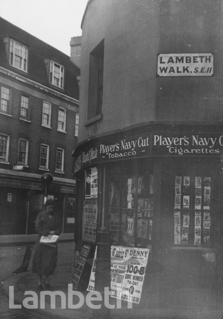 A corner newsagents and tobacconist in Lambeth Walk. Photograph possibly taken by the Rev. Thomas Tiplady of Lambeth Mission in glass negative format. ID: GNS/1/2