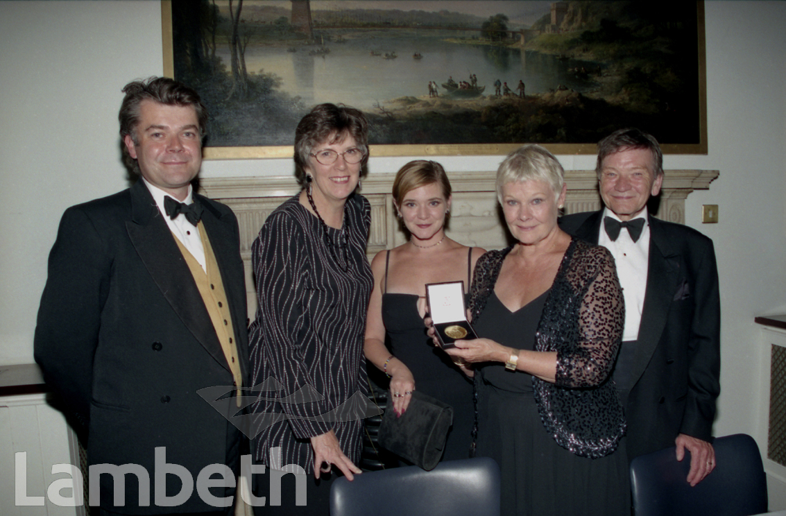 Actress Dame Judi Dench with family and Pru Leith at a dinner to commemorate her receiving the Royal Society of Arts Fellowship from the Duke of Edinburgh. Photograph by Frank Manning dated 14th June 2000. ID; 2023/1