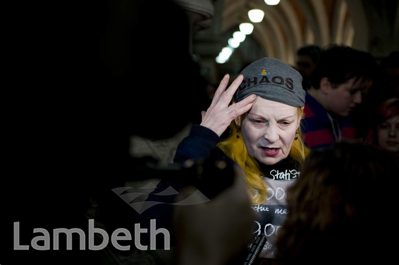 The fashion designer and Clapham resident Vivienne Westwood backstage at London Fashion Week, 21st February 2010 at the Royal Courts of Justice. One of Britain's most innovative and influential fashion designers, she invented Punk fashion in the 1970s with her then partner Malcolm McLaren, manager of the Sex Pistols band. Awarded a DBE in 2006 for services to fashion, Dame Vivienne lived in a Clapham council flat for 30 years and, although she now lives in an historic Old Town property, she is renowned for her modest lifestyle. She cycles to her Battersea studio and once remarked 'all I've got at home are two second-hand armchairs, a trestle table, a fridge and a cooker'.Photograph by kind permission of Enzo Peccinotti. Commercial reproduction not permitted without the prior consent of photographer - please contact Lambeth Archives.