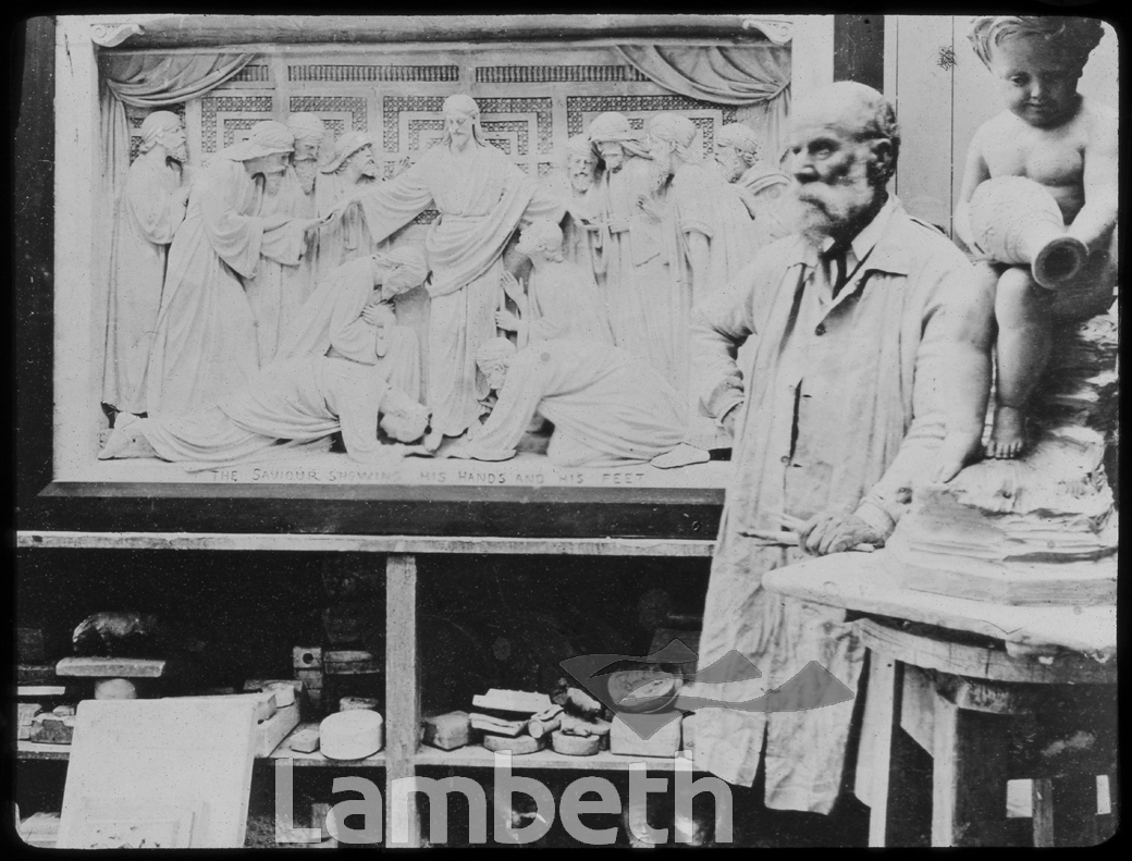Sculptor George Tinworth in his studio at Doulton Potteries in Lambeth with a terracotta panel titled 'The Saviour Showing his Hands and Feet'. From a boxed set of glass negatives produced by Doulton & Co Ltd, Lambeth, illustrating 'Tinworth Panels'. ID: GNS/1/1