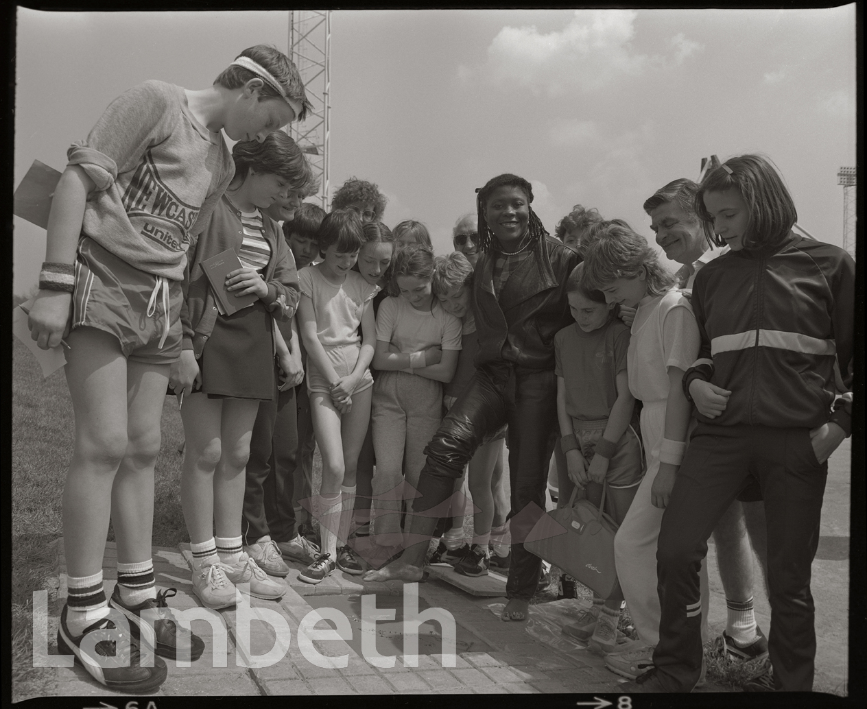 The Olympic javelin champion Tessa Sanderson (b.1956) imprinting wet concrete with her footprints at Crystal Palace - photographed by Frank Manning and dated 16th May 1985. ID: IV362/F160585