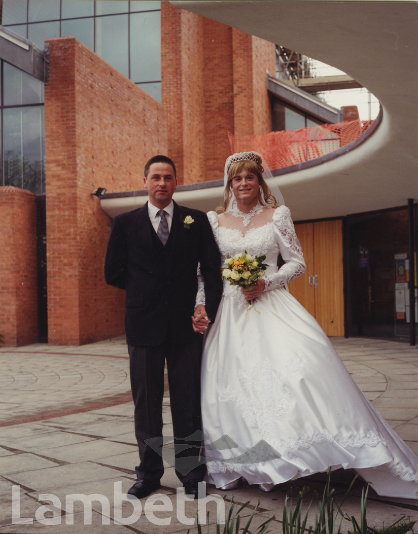 A same sex couple attending their 'fantasy' wedding outside St Barnabas Church in Dulwich, photographed by Frank Manning. Sandra Manning recalls the photoshoot was interrupted by a shout of ‘You can’t do that here’, to which Frank responded it was quite OK as he’d received the approval of the vicar, ‘I am the vicar’ came the response! Same-sex marriage has been legal since 2014 in England, Scotland and Wales, although in Northern Ireland it was not until 2020. Undated, c.1999