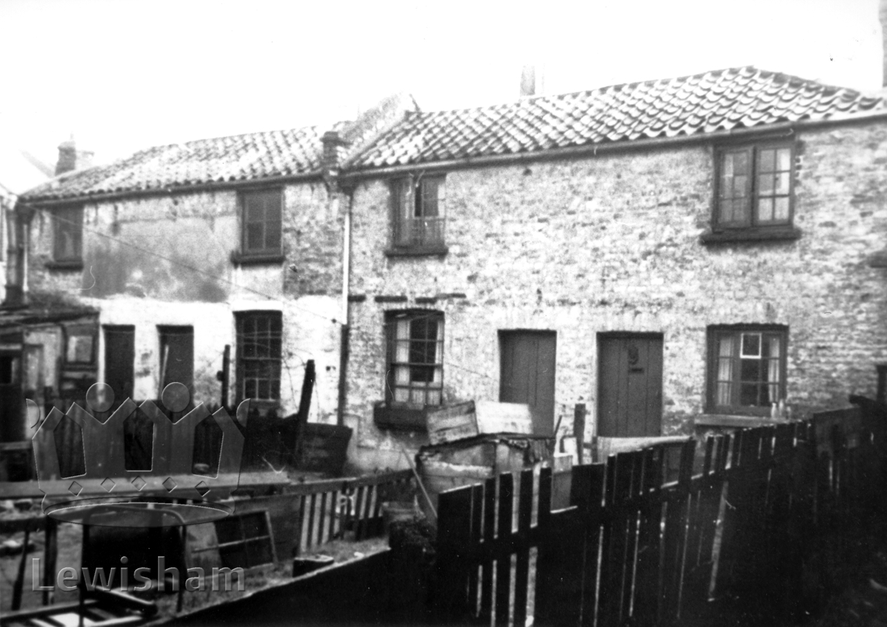 Queen's Bench, four cottages in two right-angled pairs, was one of several curious pieces of back development squeezed into odd corners of the common land known as Rushey Green shortly after it was enclosed by an act of parliament in 1810. The nine or ten acres made available for building then provided sites for nearly all the working class housing and shops the slowly growing Catford needed until the 1880s. Queen's Bench was demolished as part of a slum clearance programme shortly after this photograph was taken.