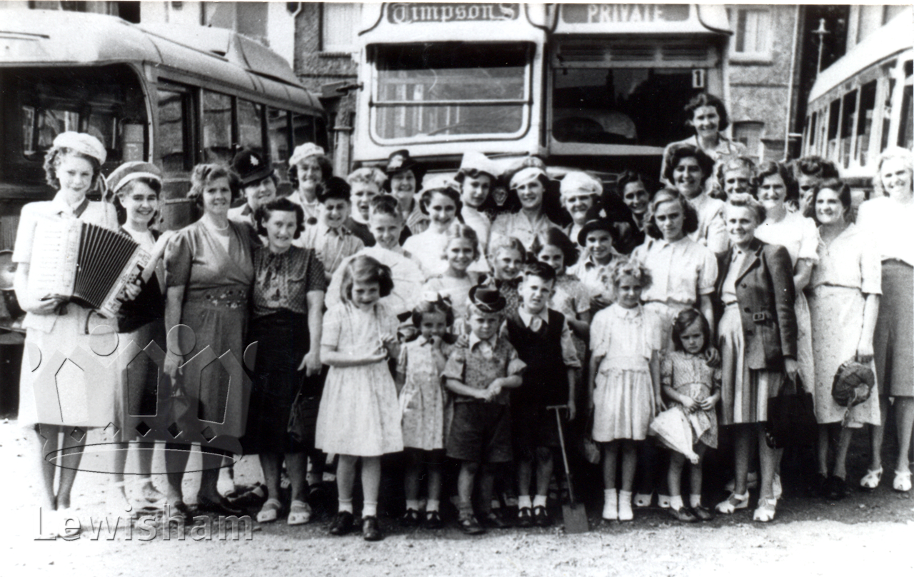 Black and White photo of mothers and their children awaiting their outing in front of their bus at Grove Park Estate, c.1946