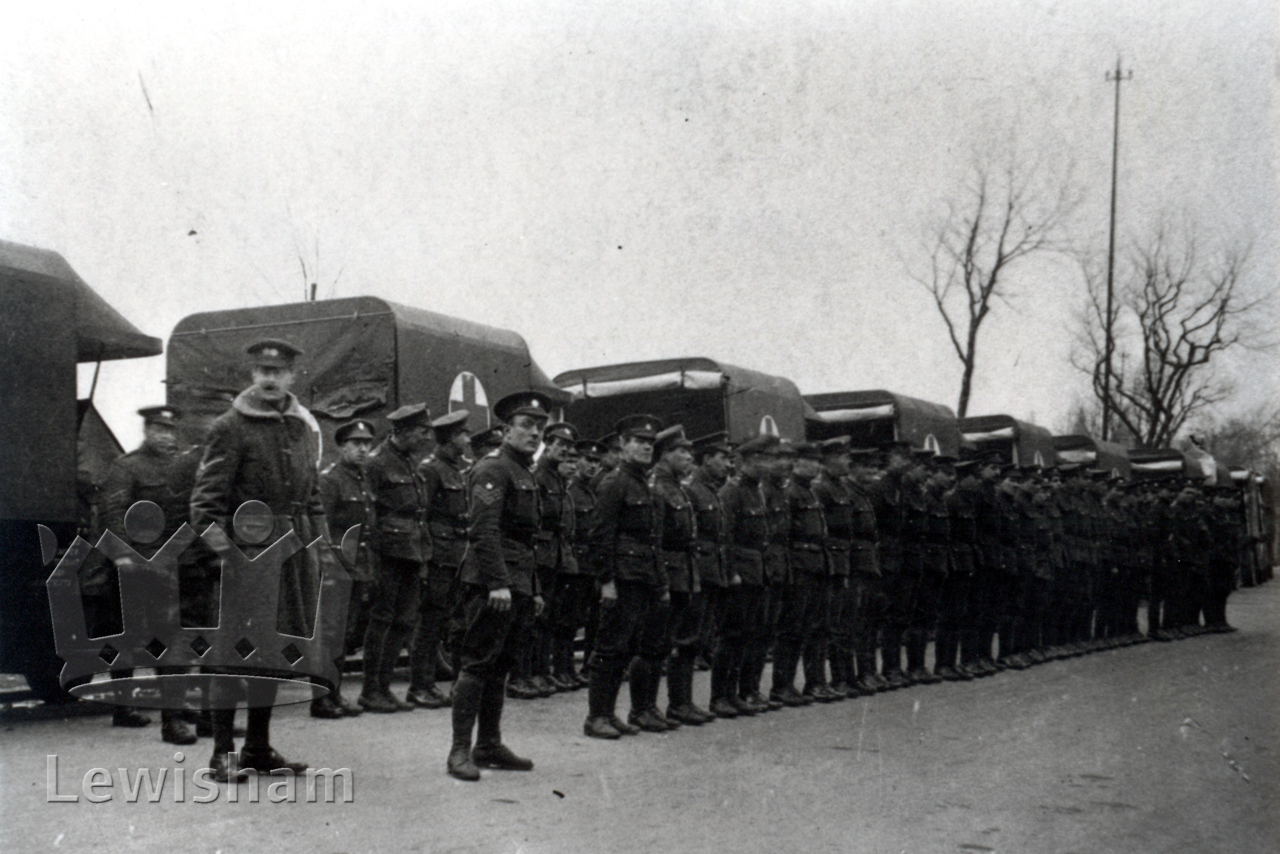 Army Service Corps personnel in Grove Park between 1914-1918. The Corps in uniform are standing in front of a row of ambulances.