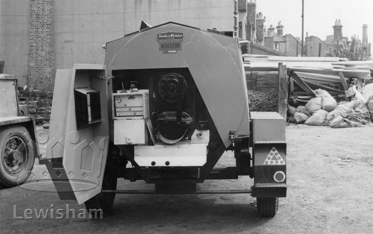 Black and White photograph of rear view of an Asphalte machine built by Shields & Whitaker, Ffinch Street, Deptford 1967