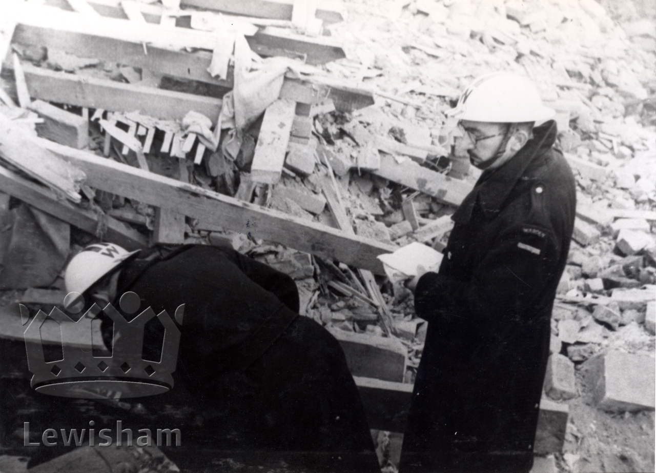 Damage to Arica Road, Brockley. Two wardens in uniform inspecting the damage.
