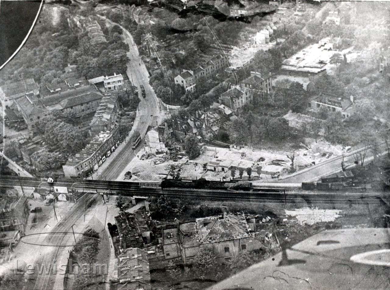 Black and White Photograph of Bomb damage to Lewisham Hill/High Street.
