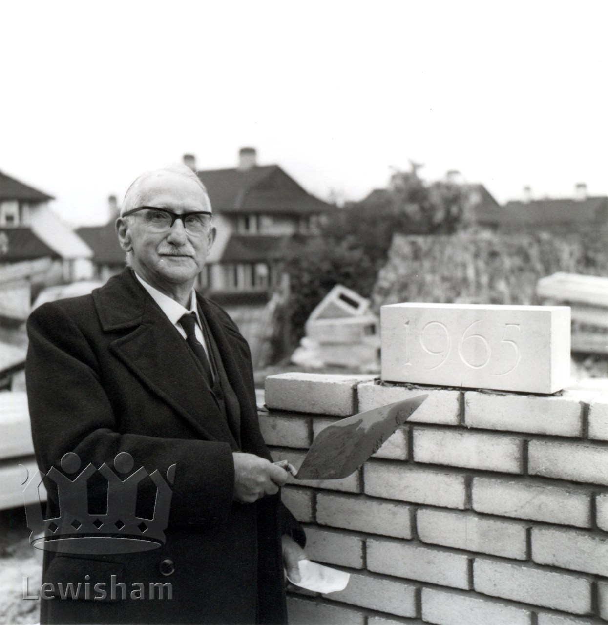 Black and White photo of Mr S.B. Causer laying the foundation stone of the new church hall, 1965