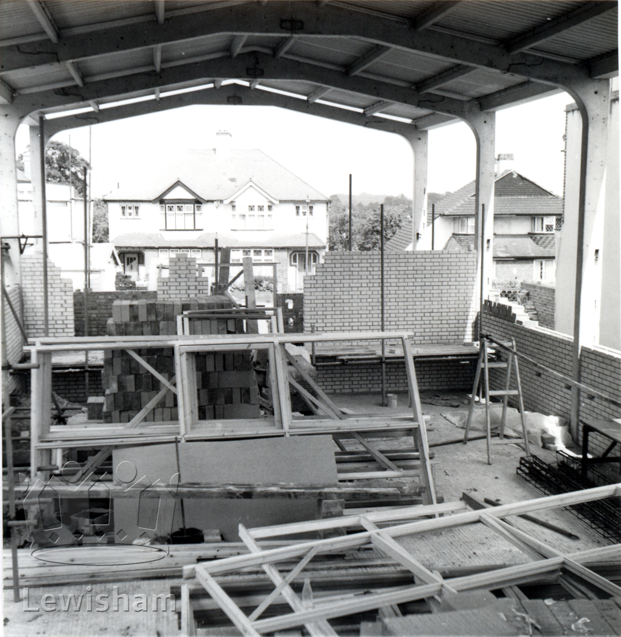 Black and White photo taken from the inside of the new church hall undergoing construction, 1965