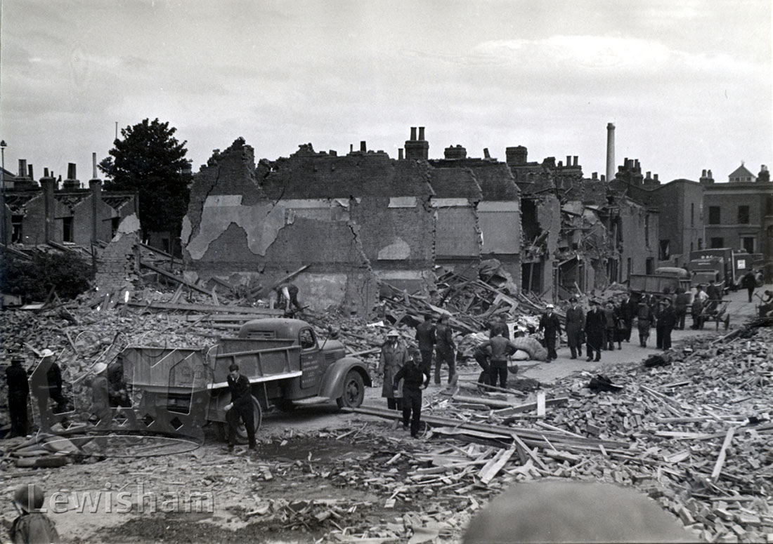 Black and White Photograph of Clearing the site Men and equipment clearing a bomb site after an air-raid.