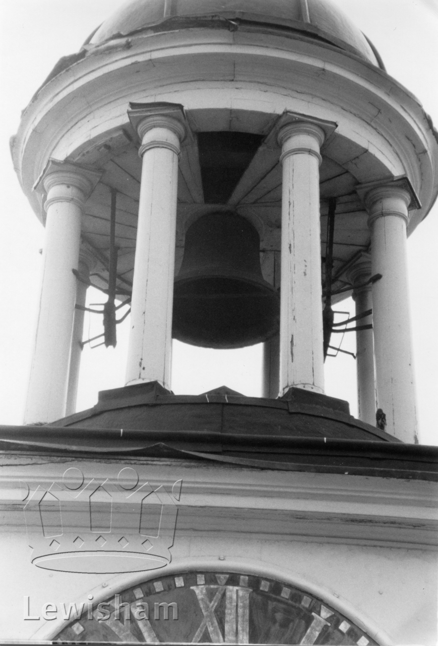 Black and White photograph showing the clocktower (18thc?) -upper section (bell), photo taken 22/6/1982