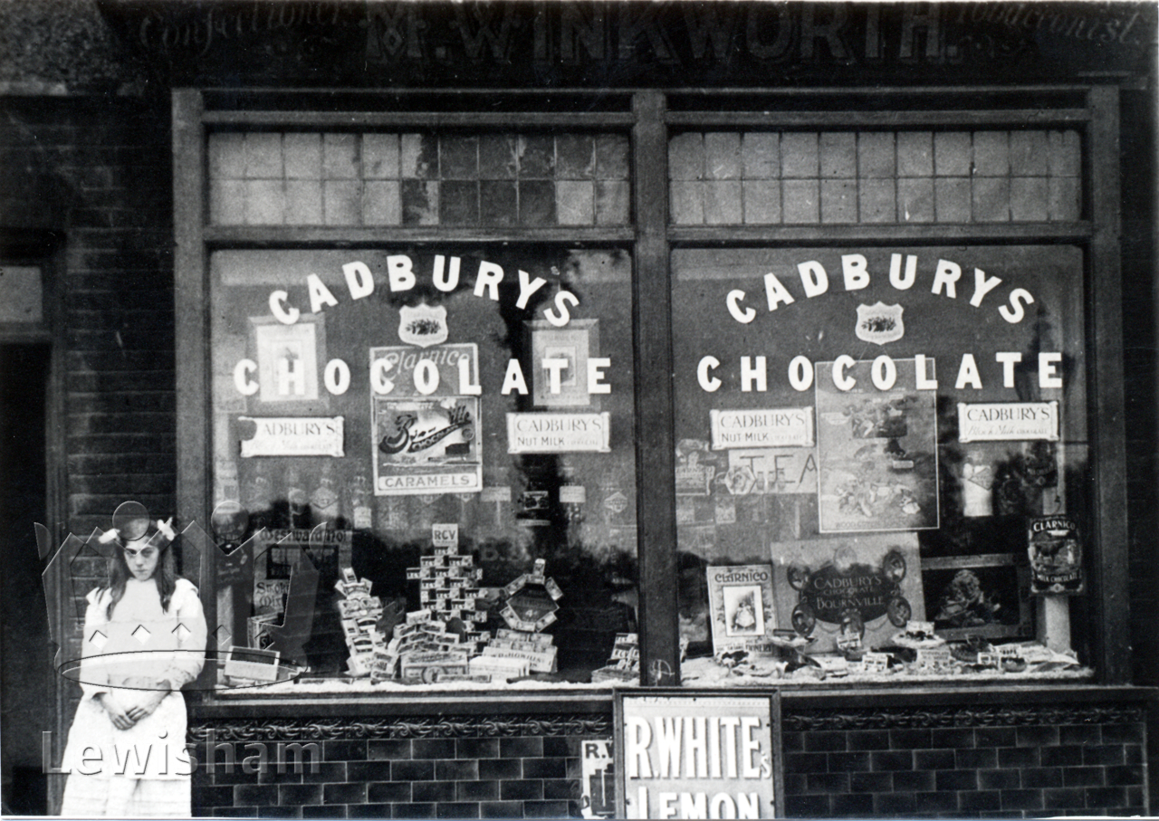 Black and White photo of shop front displaying products and advertisements for Cadburys Chocolate anf R. White's lemonade