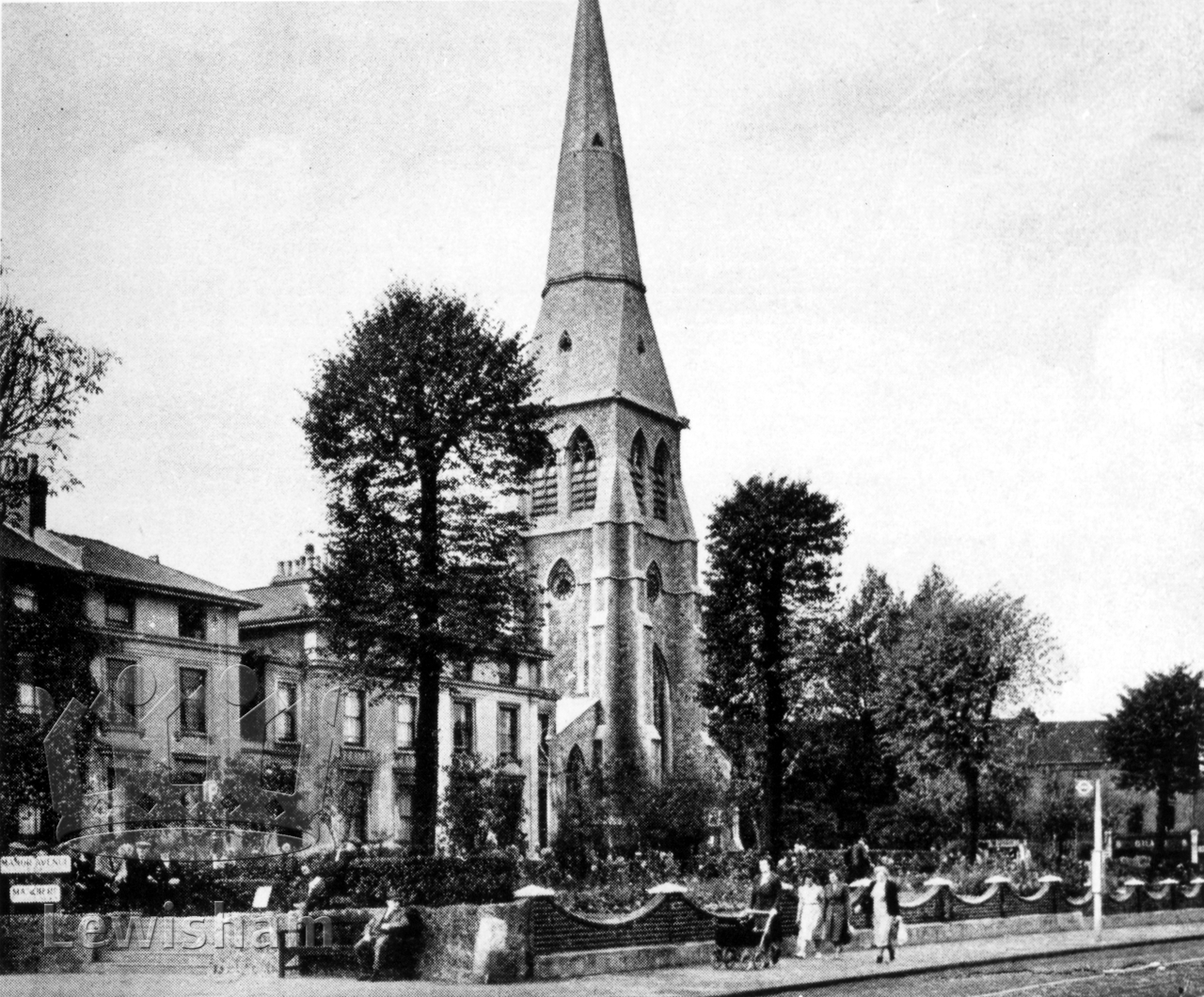 Black and White photograph showing exterior of Congregational Church and Memorial Gardens, Lewisham Way