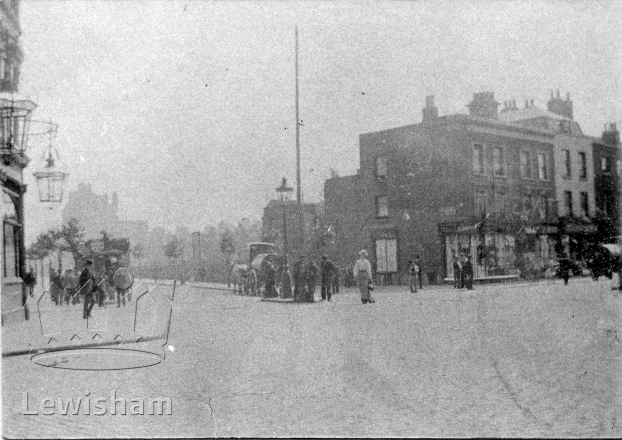 Black and White photograph showing Creek Road, junction with Evelyn Street and High Street