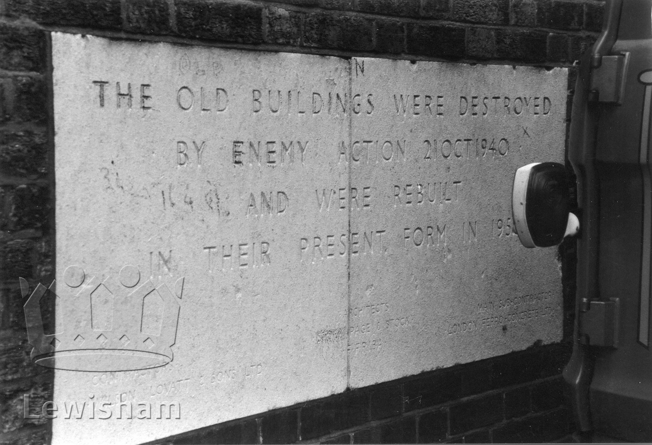 Black and White photograph of cattle market wall, showing stone commemorating post-war rebuilding of 1899 cattle-market buildings, 1950?. Taken 22/6/1982