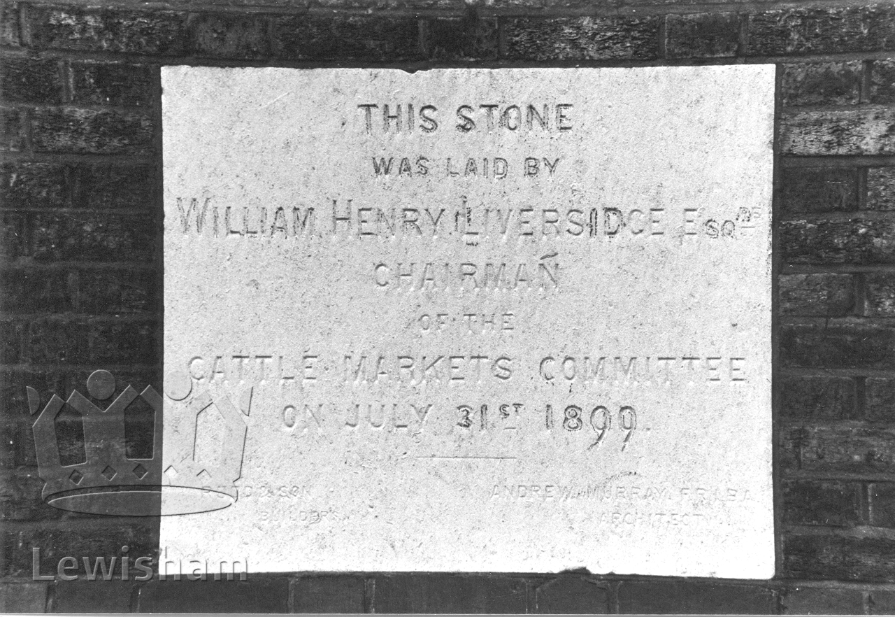 Black and White photograph showing the foundation stone to the Cattle Market buildings, Deptford Dockyard laid 1899. photograph taken 22/6/1982