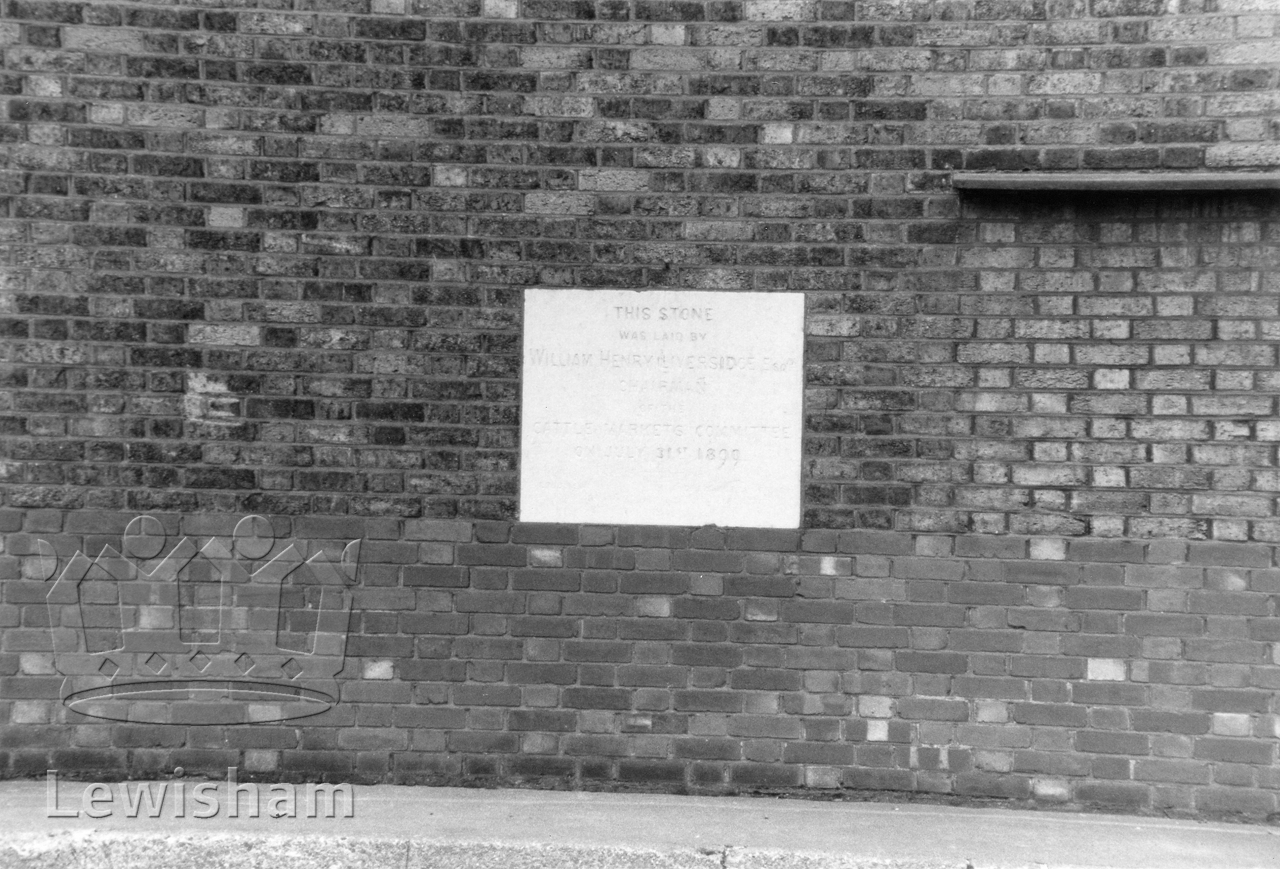 Black and White photograph showing 1899 foundation stone of Cattle Market buildings, resited in post-war replacements. Taken 22/6/1982