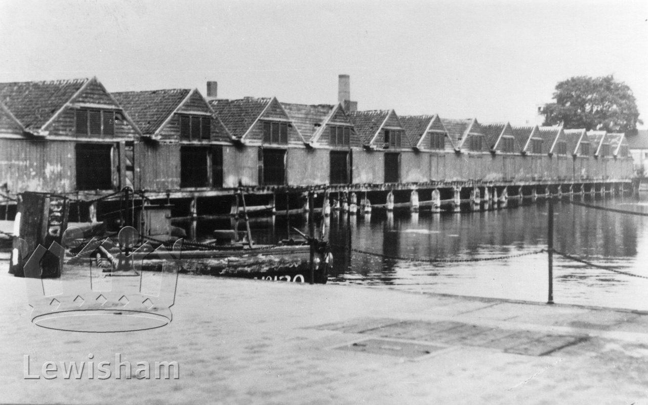 Black and White photograph showing the old mast houses (Deptford Dockyard ?) Built c1766