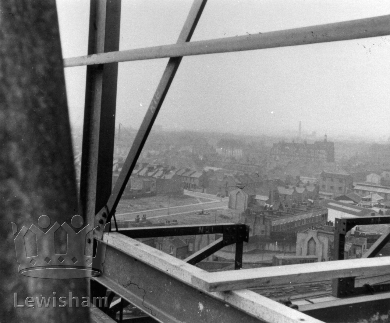 Black and White photograph showing aerial view over Deptford Wharf, late 1960s