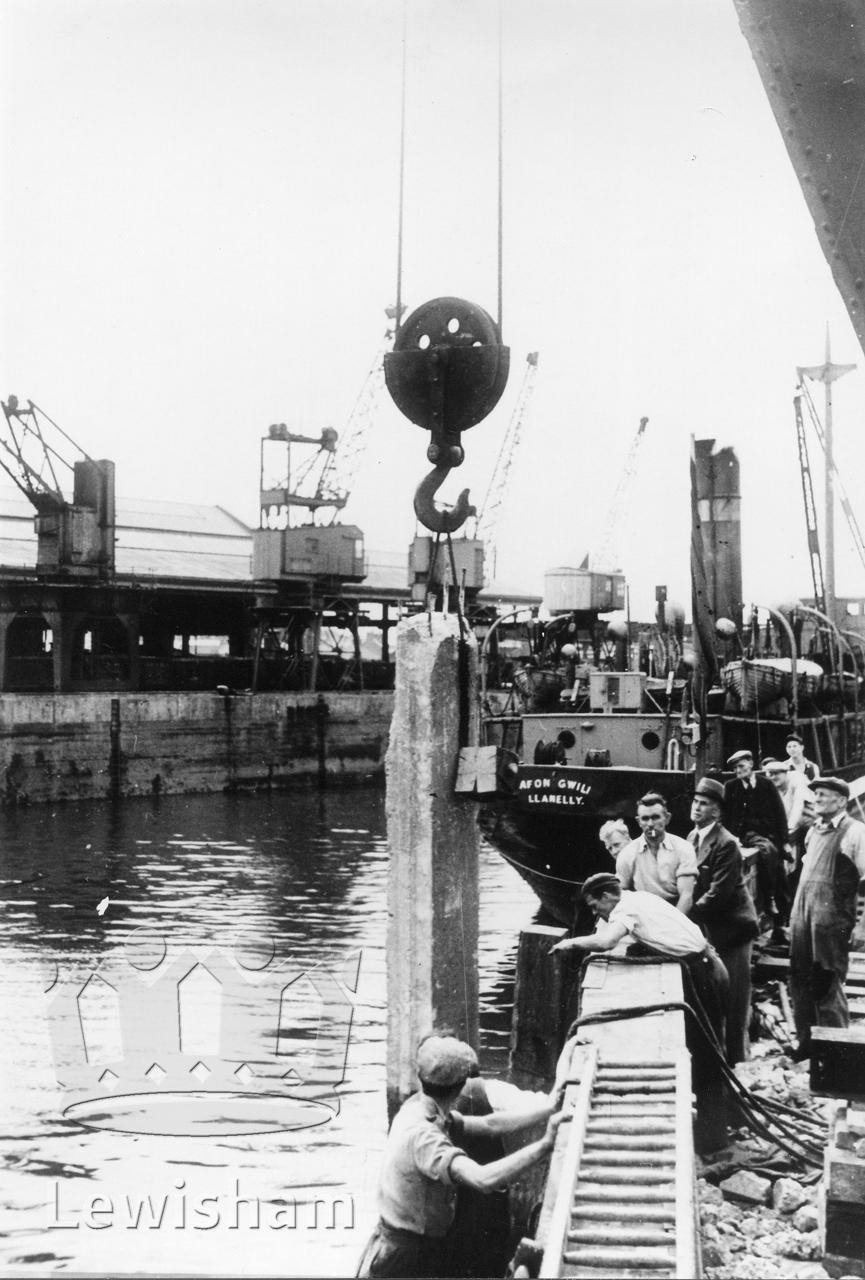Black and White photograph showing Deptford Wharf, 1949 - withdrawing a pile from the old wall