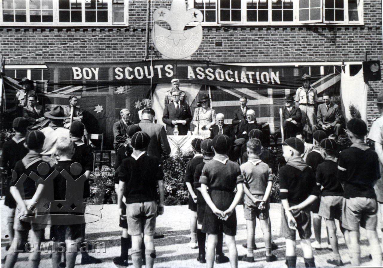 Black and White photo showing Rt. Hon. Herbert Morrison giving a speech to the scouts at the Flower Show at Coopers Lane School, 23/8/1947