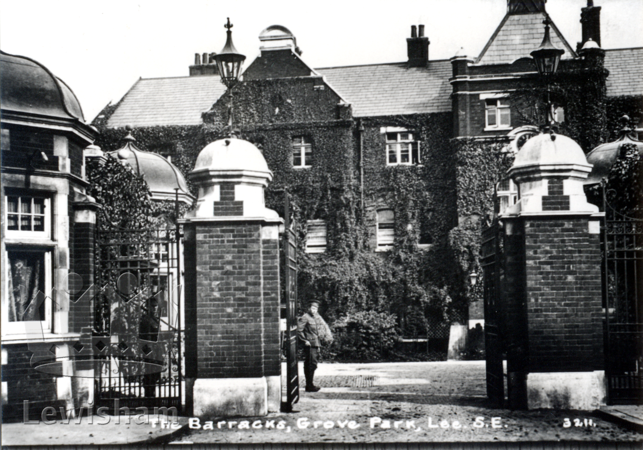 The gates of the Army Service Corps Barracks (later Grove Park Hospital). Troops in uniform present infront of the gates.