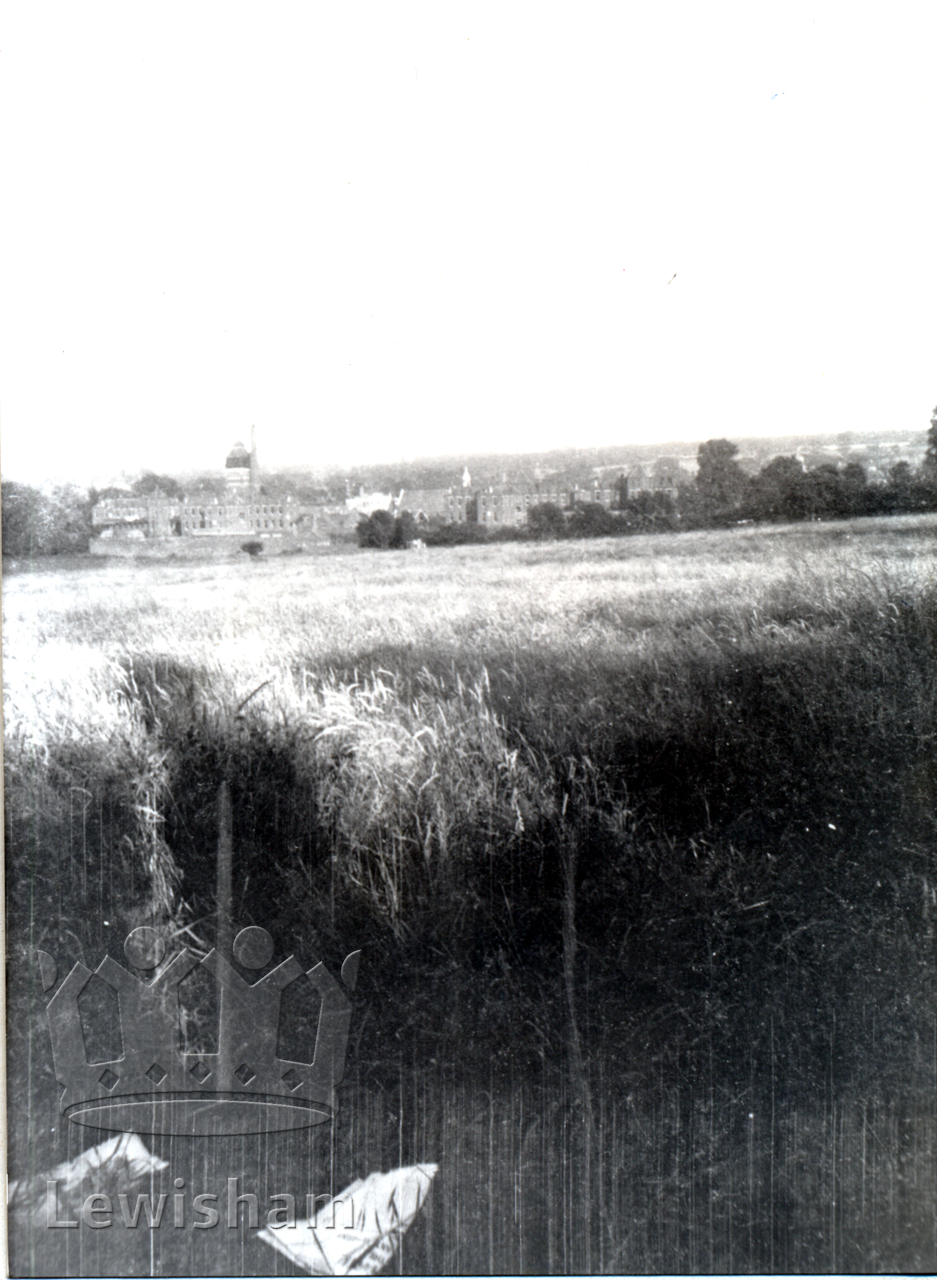 Black and White photo of the hospital taken across the fields from Burnt Ash Hill, c.1930s