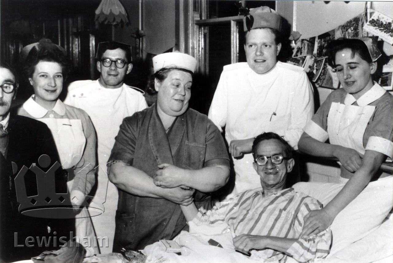 Black and White photo of staff and a patient at Christmas at Grove Park Hospital, 1958
