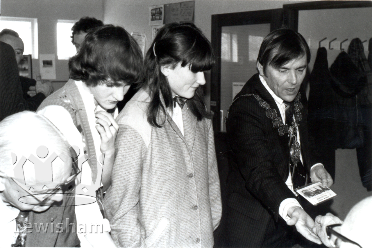 Black and White photo of Councillor Terry Scott (Mayor of Lewisham) and members of the public at the exhibition, 7/4/1979
