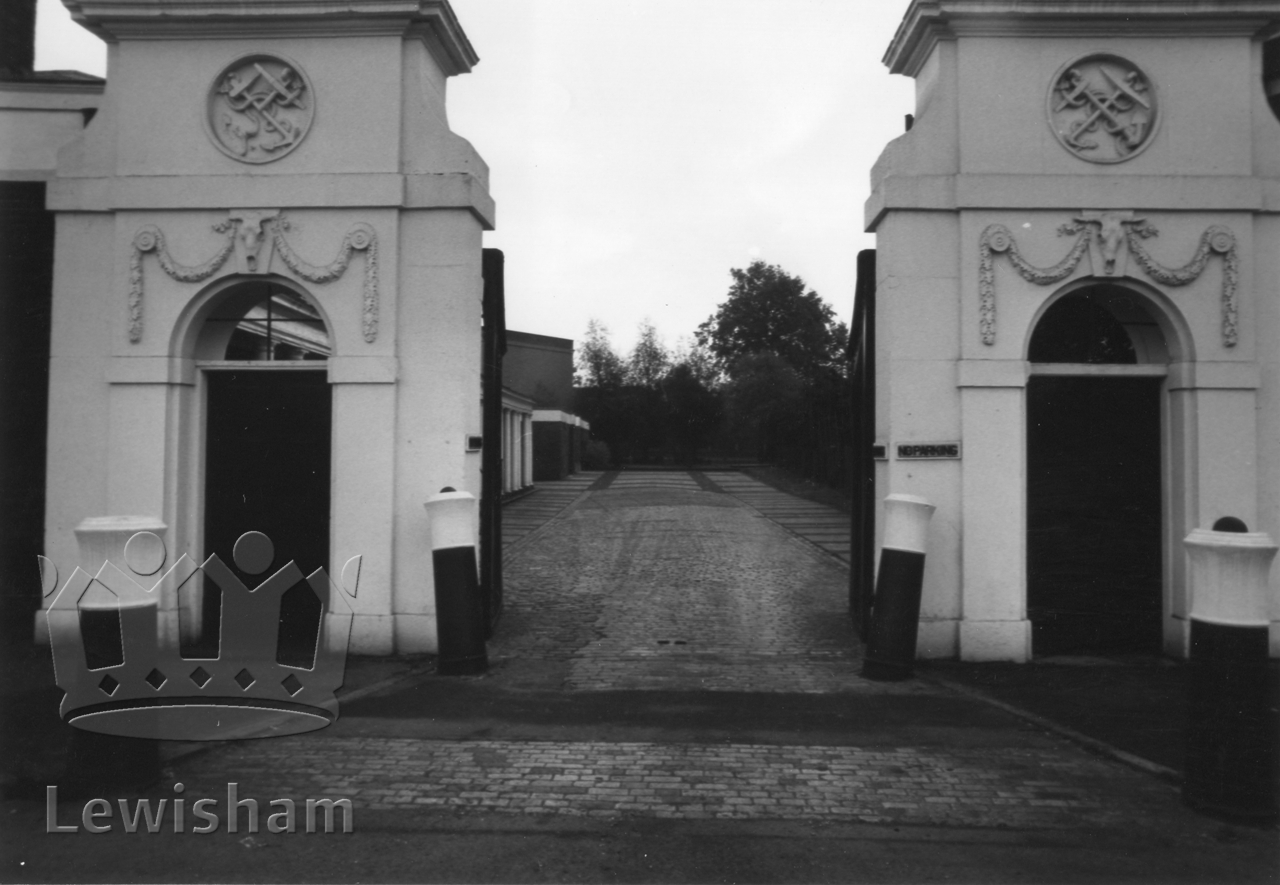 Black and White photograph showing entrance to Royal Victoria Yard, Grove Street; gate, piers and cannon ports