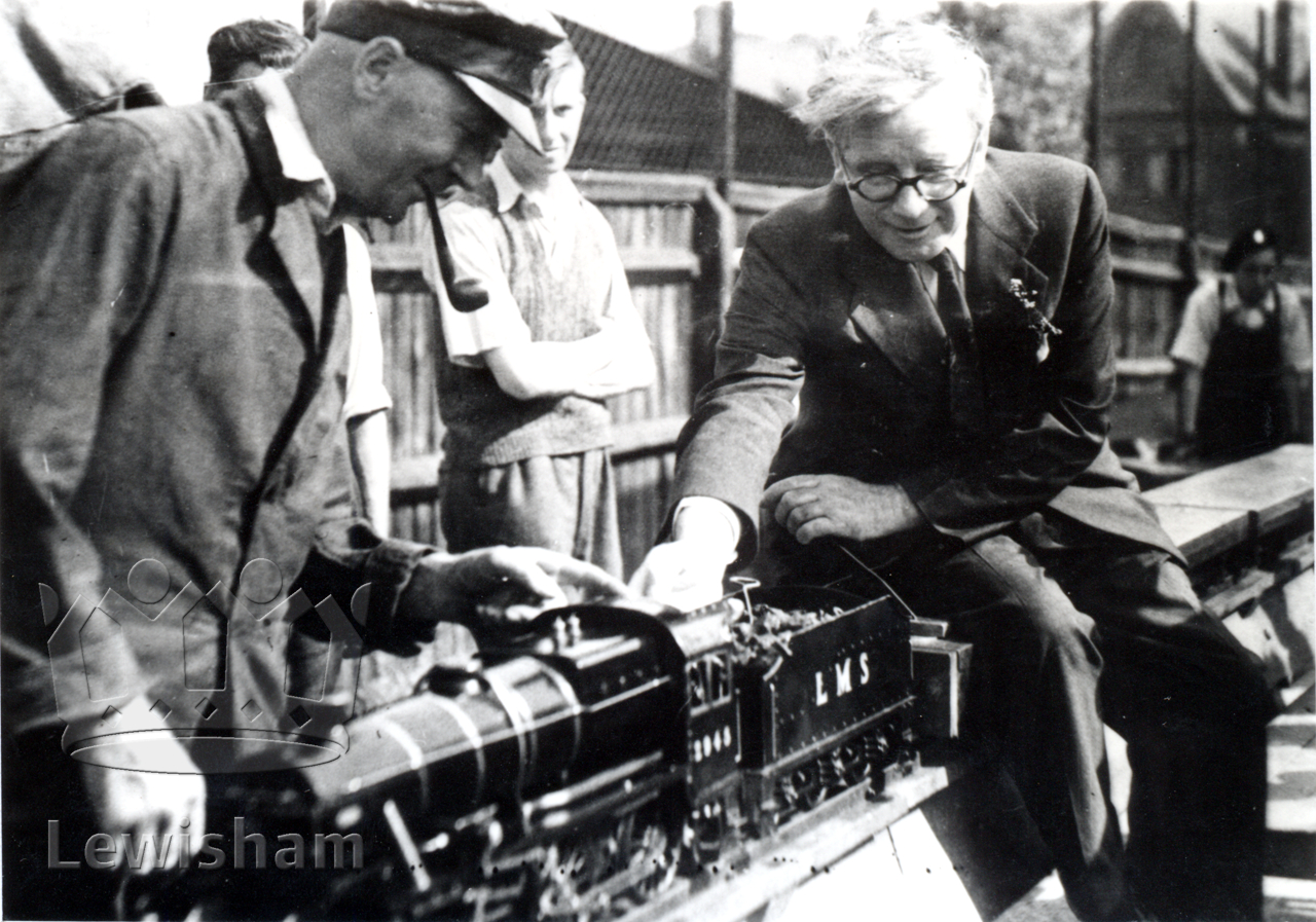 Black and White photo showing Rt. Hon. Herbert Morrison playing with a model train at the Flower Show, 23/8/1947