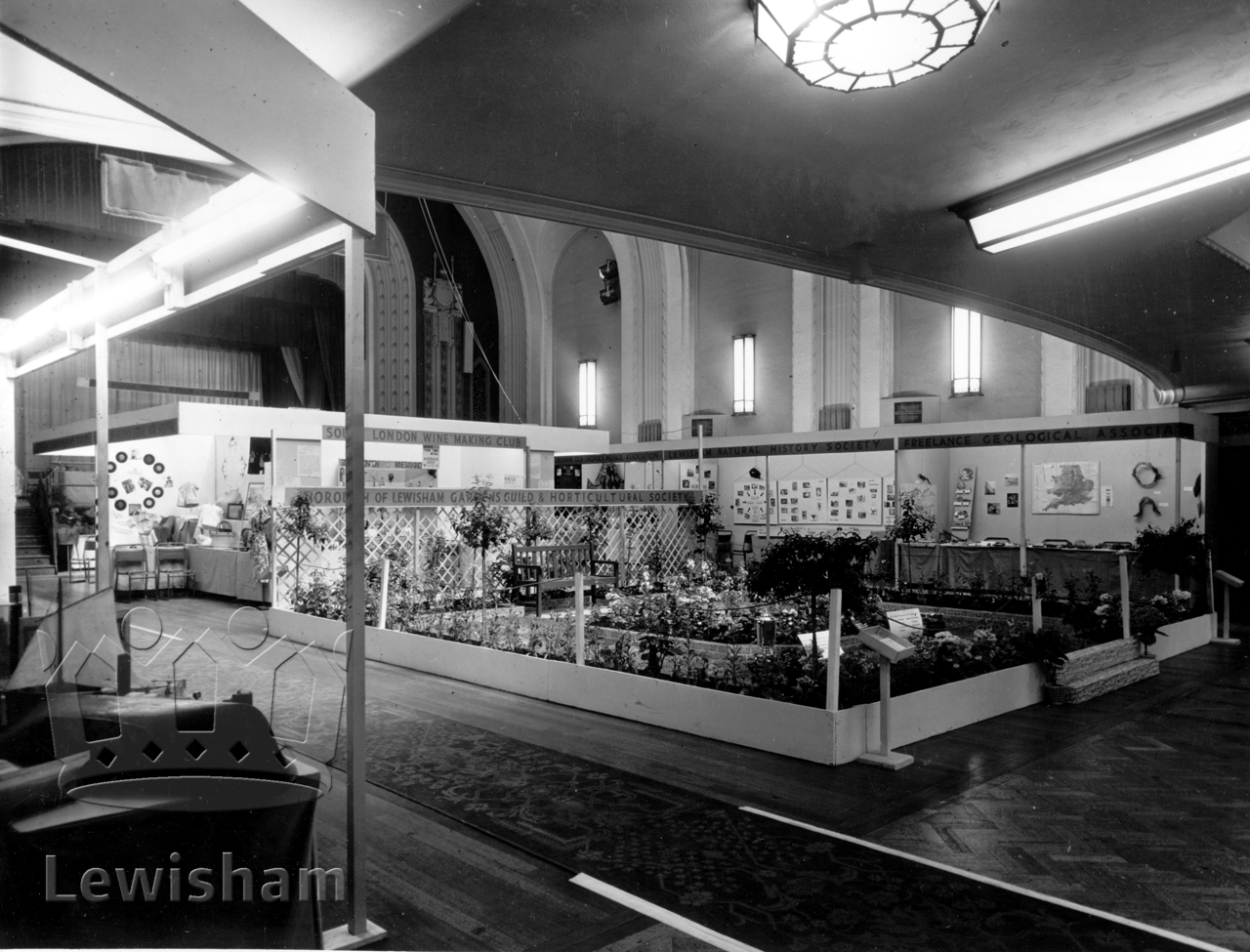 Black and white Photograph of Hobbies and handicrafts exhibition at Catford Town Hall. Exhibiting organisations shown include Borough of Lewisham Gardens Guild and Horticultural Society, Lewisham Old People's Welfare Association, Lewisham Natural History Society, Freelance Geological Association and South London Winemaking Club. 1959