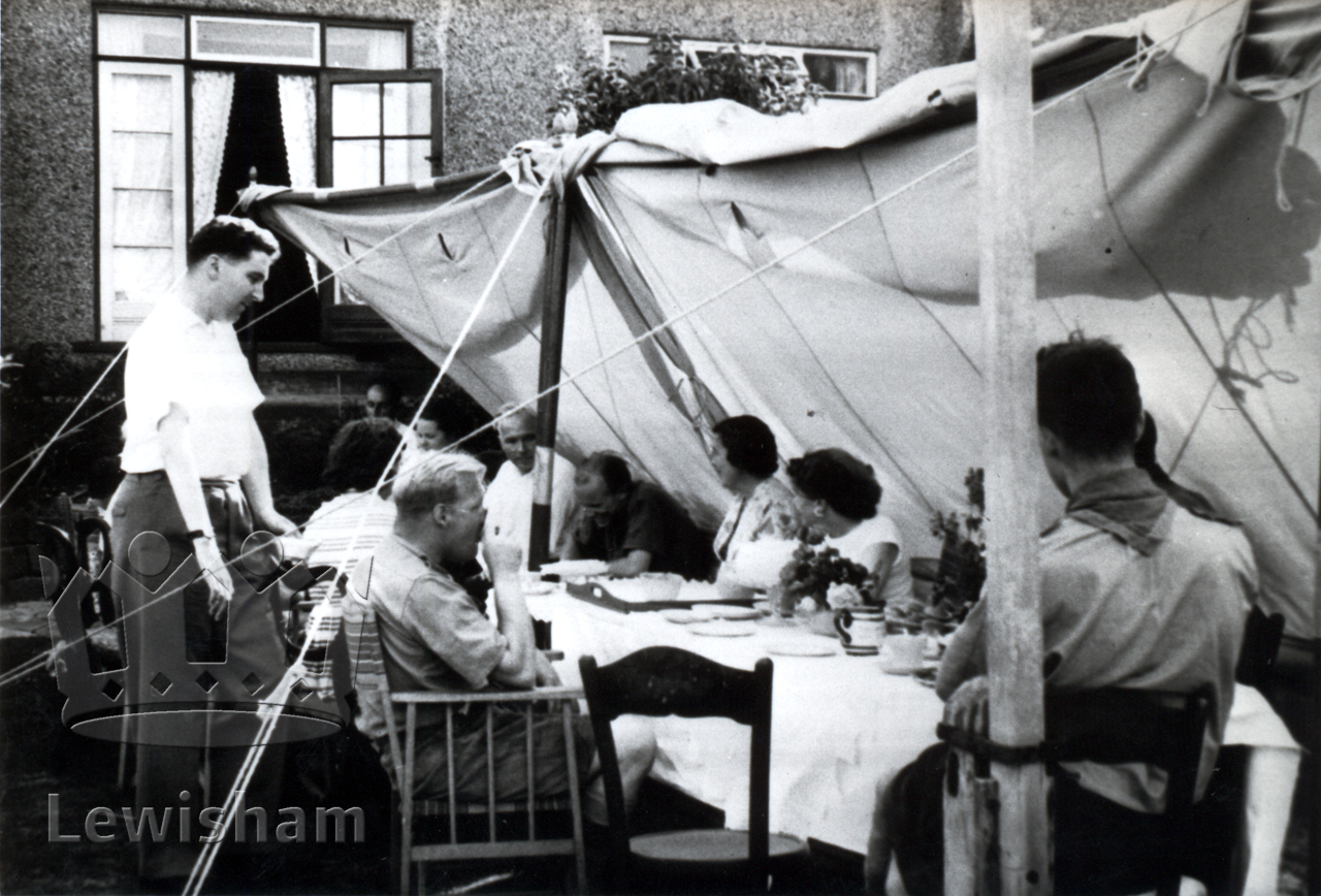 Black and White photo of members drinking tea under a tent in the garden of 145 Marvels Lane, 1957