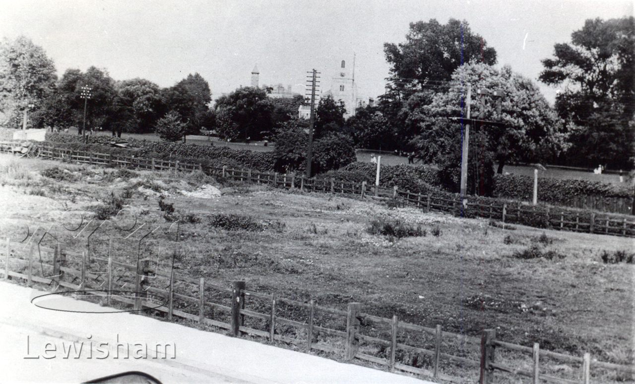 Black and White postcard showing Ladywell Fields from Railway Terrace