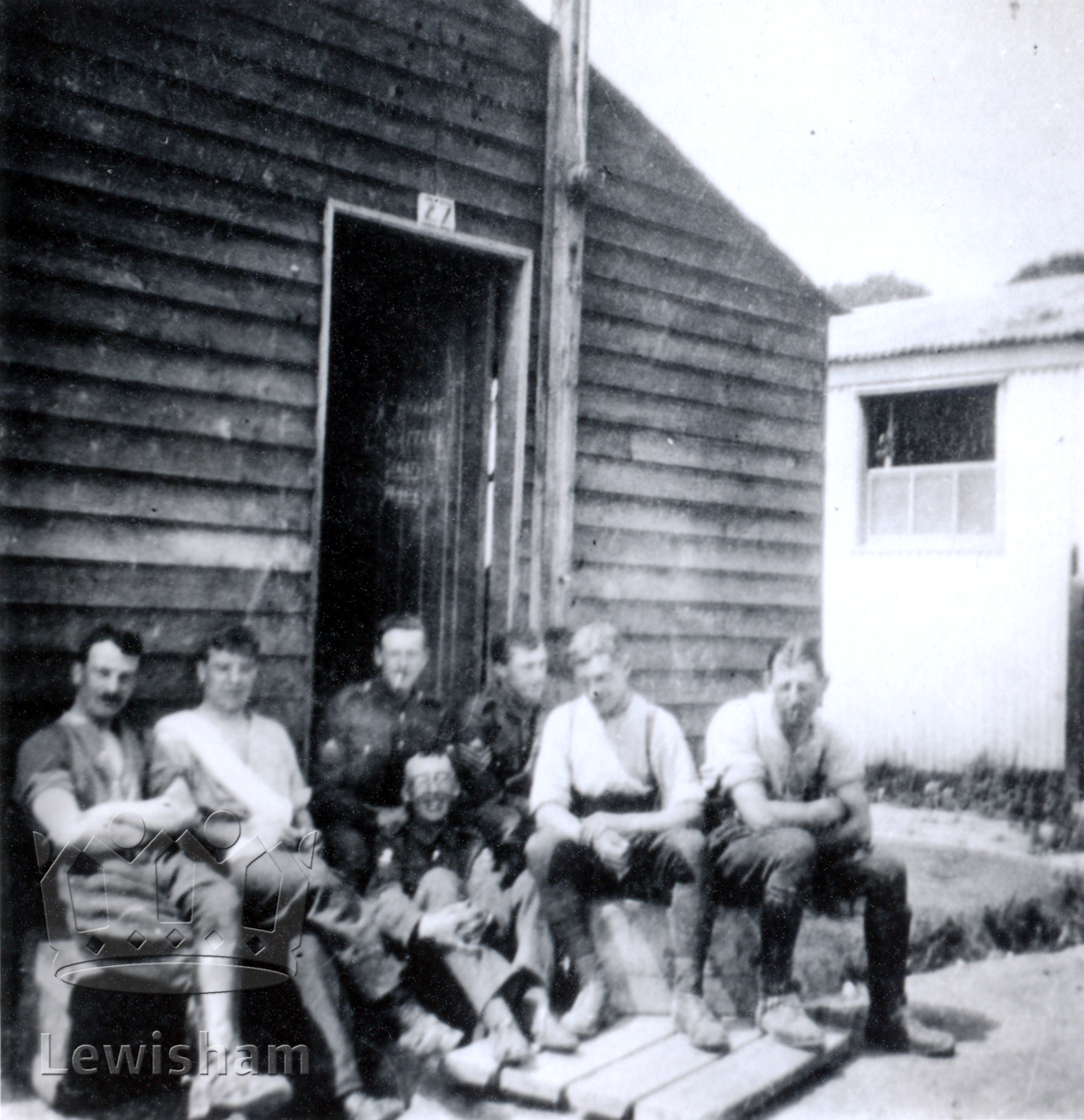 A group of Lewisham Volunteers resting between 1915-1919. In civilian dress, no uniform visible. "Flanders Mud"