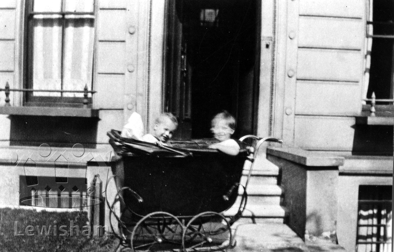 Black and White photograph showing 2 small children in a pram outside no 49 Lewisham Way