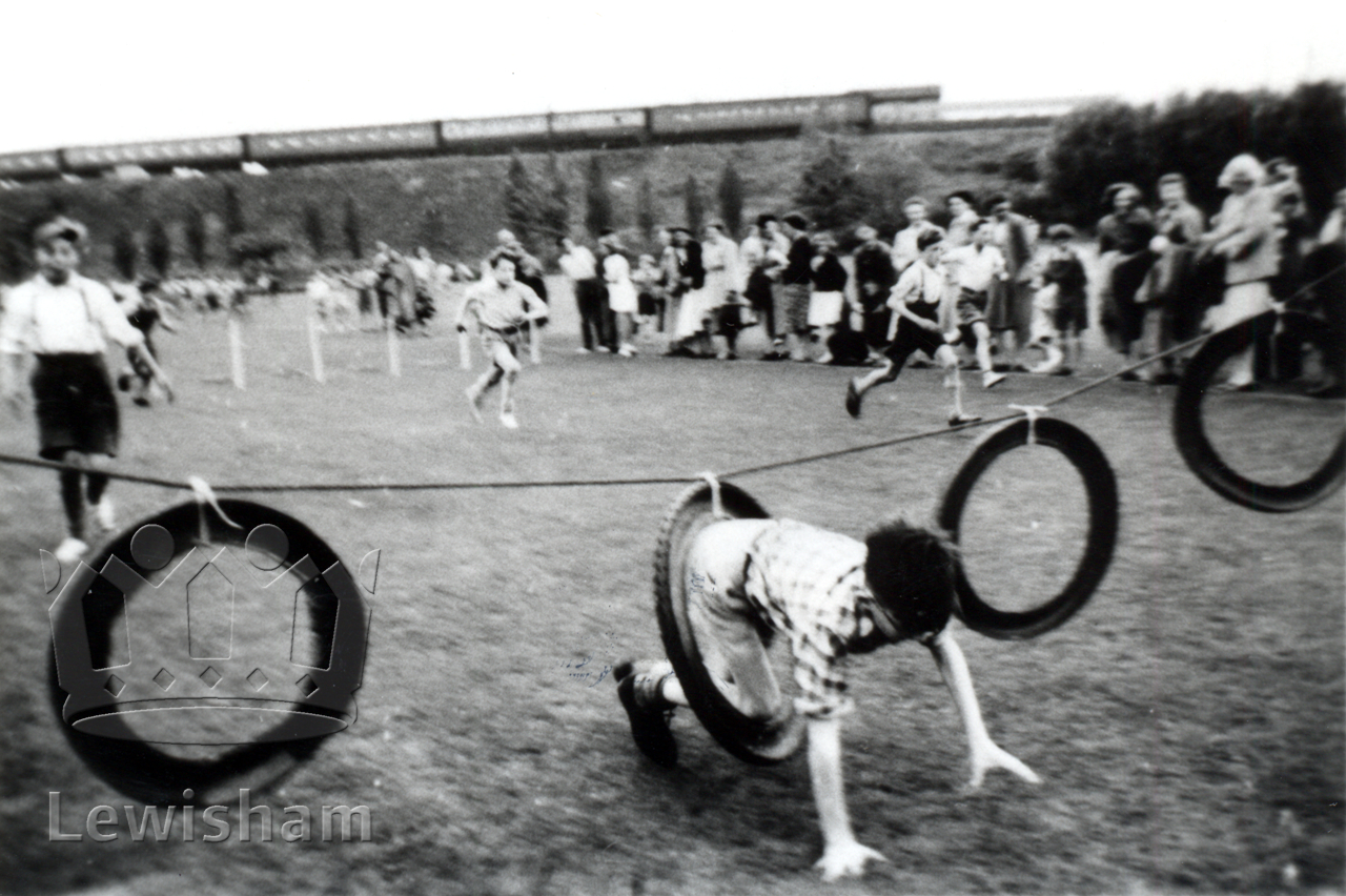 Black and White photo of Marvels Lane School Sports Day in Chinbrook Meadows, July 1954