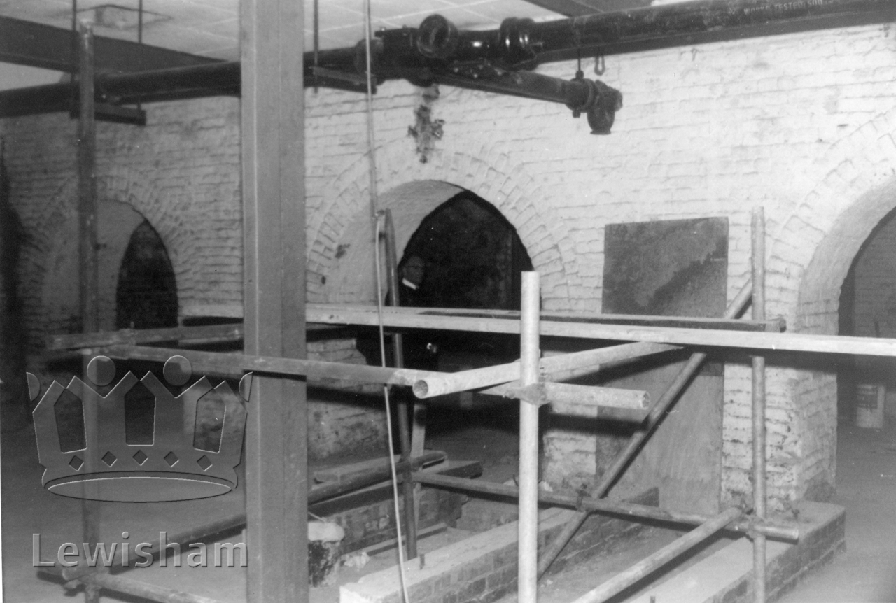 Black and White photograph showing the re-designing of the old rum warehouse, 1970, showing main drainage pipes in the basement