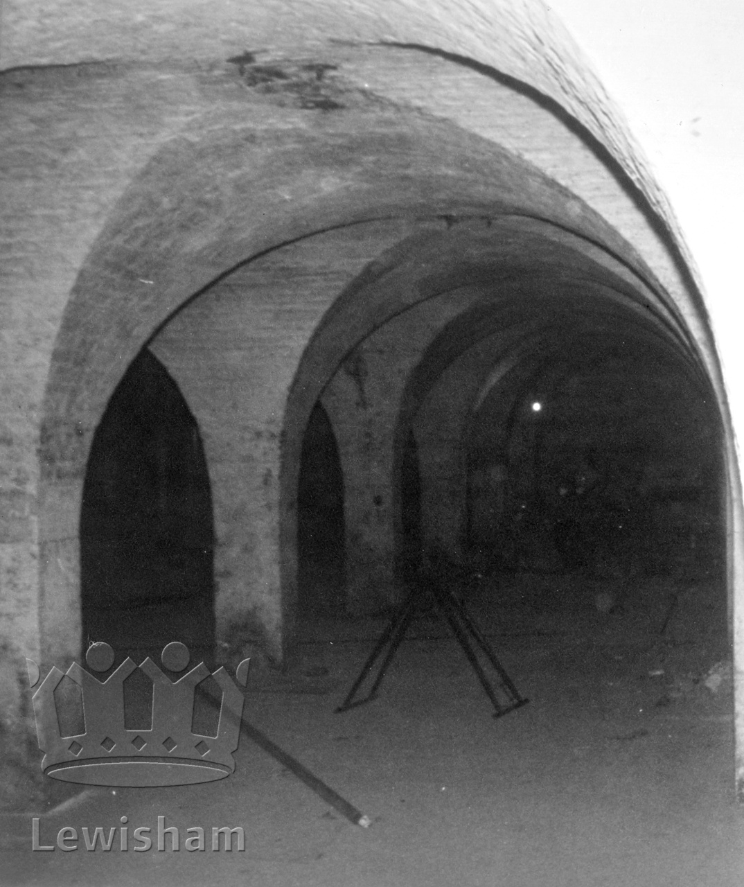 Black and White photograph showing the re-designing of the old rum warehouse, 1970, showing the vaulted basement