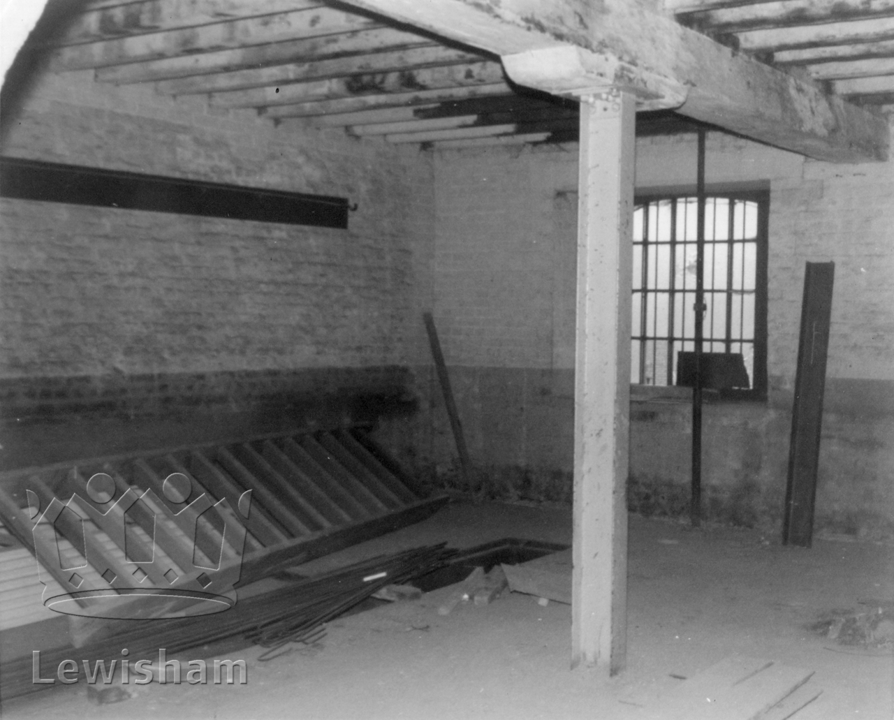 Black and White photograph showing the re-designing of the old rum warehouse 1970. Small section of ground floor with staircase to flats on right, the window is on the rear wall of the building.