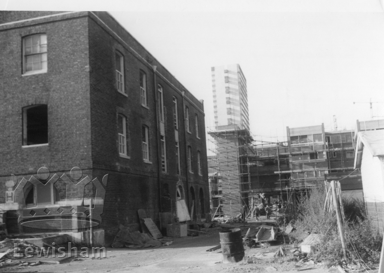 Black and White photograph showing the re-designing of the old rum warehouse, 1970, front corner of exterior
