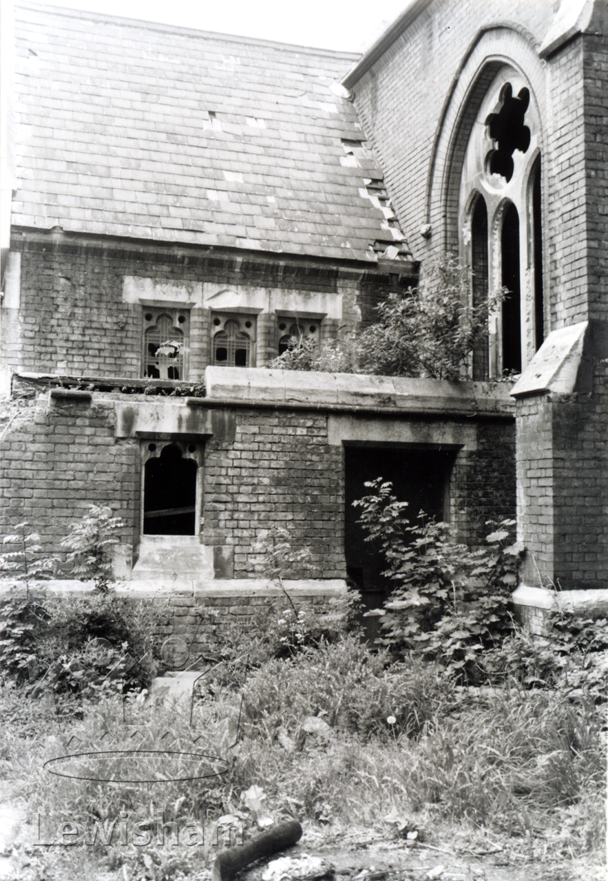 Black and White photo of broken stained glass window and south transept, 2/6/1982