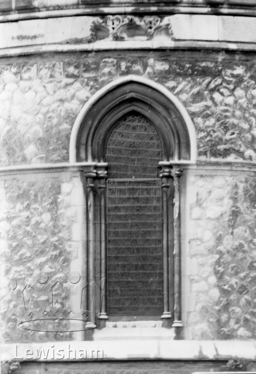 Black and White photograph showing exterior of St Luke's Church, Evelyn Street; center-east window, showing mouldings above