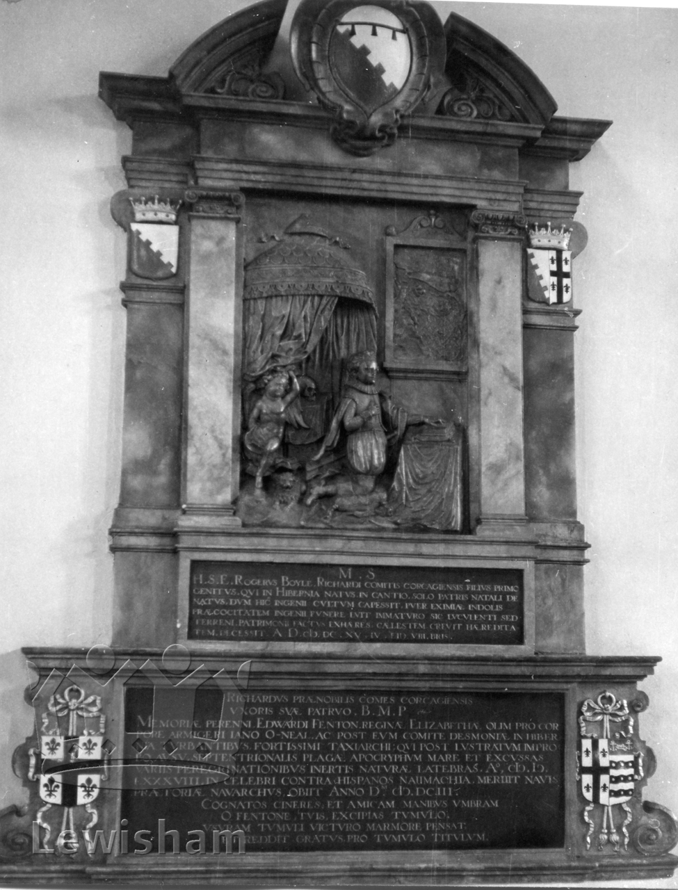 Black and White photgraph showing interior of St Nicholas Church- tomb of Fenton family