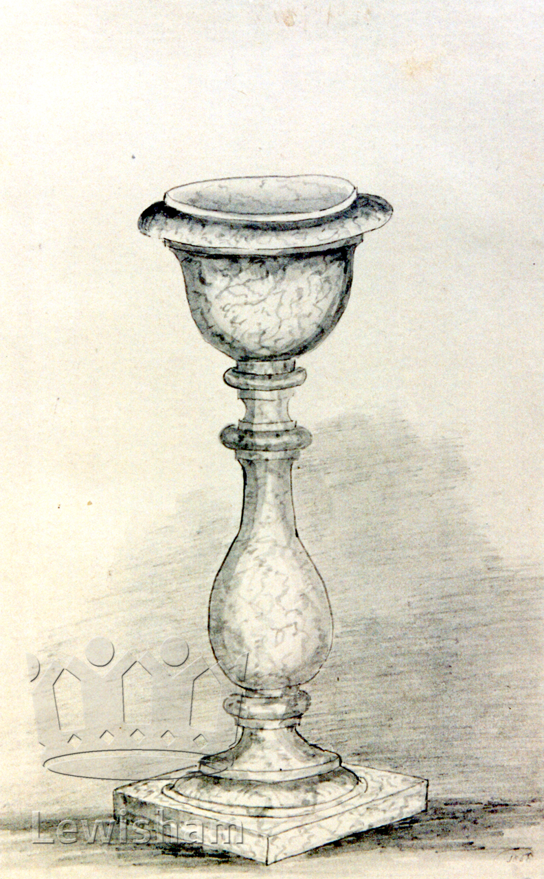 colour artwork showing the font in St Paul's Church by Frederick Ashford